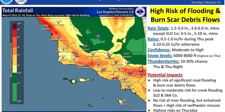 LOS ANGELES, CA – Officials are warning Southern California residents to brace for two powerful storms set to bring heavy rainfall, high winds, and a heightened risk of flooding and mudslides, particularly in areas recently scorched by wildfires. State and local emergency crews have been mobilized in preparation for the severe weather, with Governor Gavin Newsom overseeing response efforts in vulnerable regions.